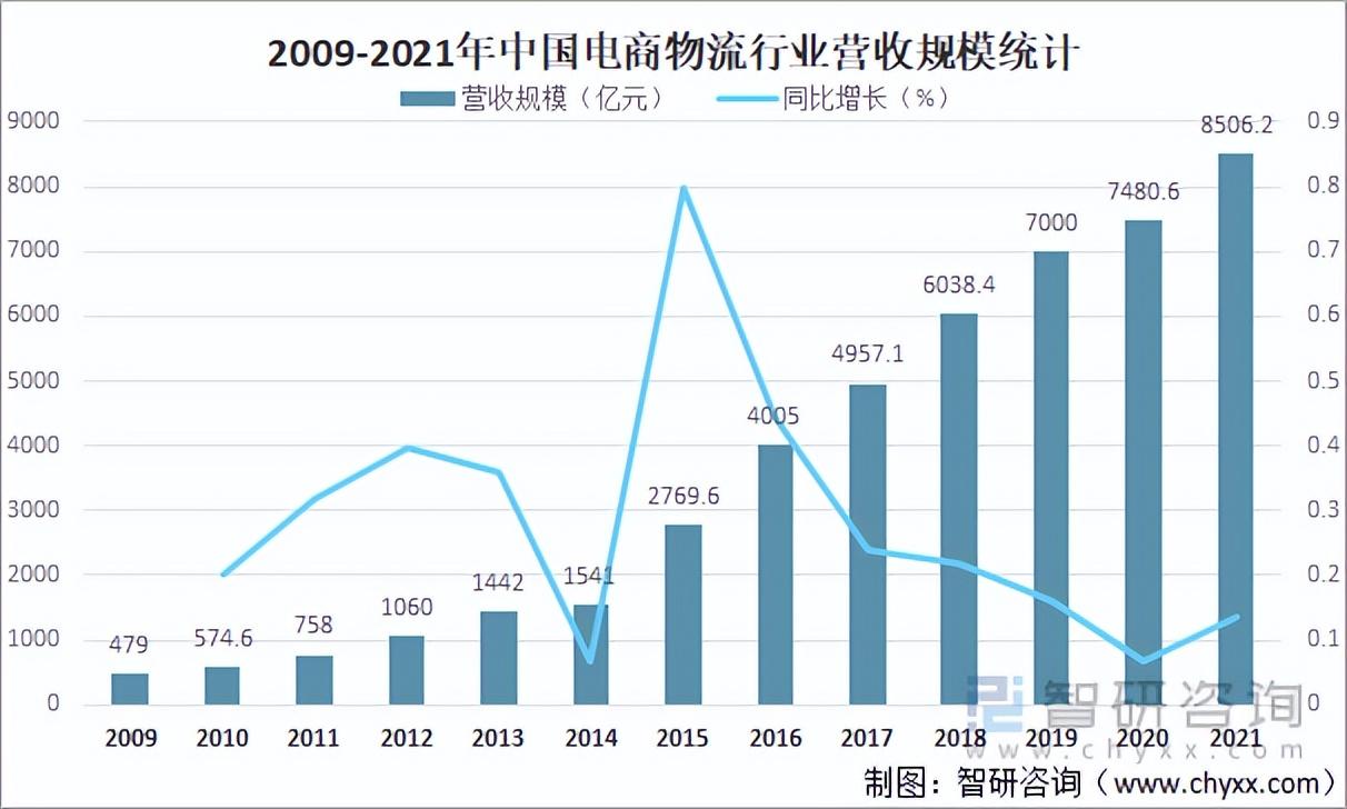 电商市场的繁荣,促使中国电商物流市场规模不断扩大,2019年中国电商物流行业营收规模达7000亿元,较2018年增加了961.60亿元,同比增长15.92%,如用2020和2020年中国电子商务交易额的增速6.87%和13.71%来测算电商物流行业营收规模,则2020和2021年年中国电商物流行业营收规模分别为7480.6亿元和8506.2。
