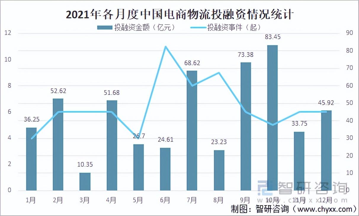 从月度数据来看,2021年2月、4月、7月、9月、10月中国电商物流市场投融资金额均超过50亿元,其中10月更是达到83.45亿元,居全年最高峰值。