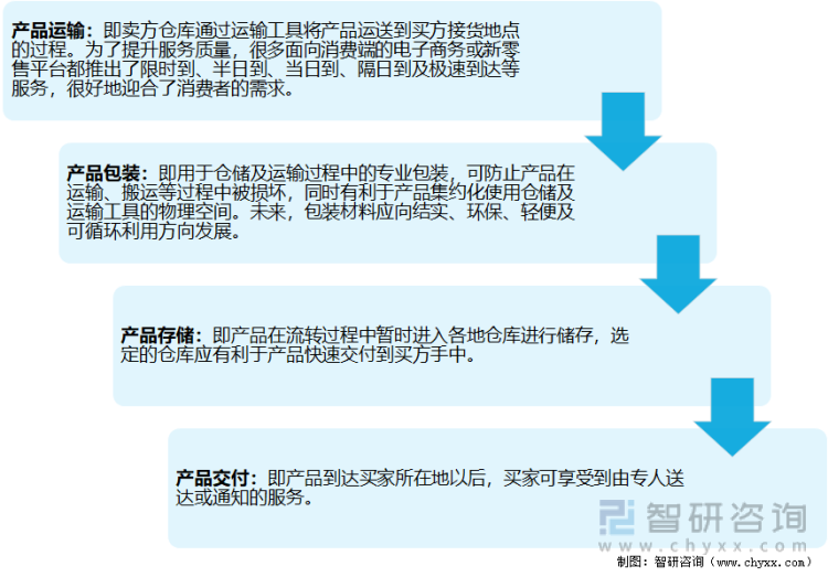 如果将电子商务比作一辆汽车,物流就相当于汽车的发动机,贯穿于电子商务整个过程之中。电子商务中的物流(简称“电商物流”)是以满足买方需求为目标,通过电子交易系统把制造、运输和销售等环节统一起来进行考虑,涵盖了运输、搬运、储存、保管、包装、装卸和物流信息处理等基本功能,由供应地流向接收地以满足社会需求的经济活动,电商物流主要包括产品运输、产品包装、产品存储、产品交付等环节。