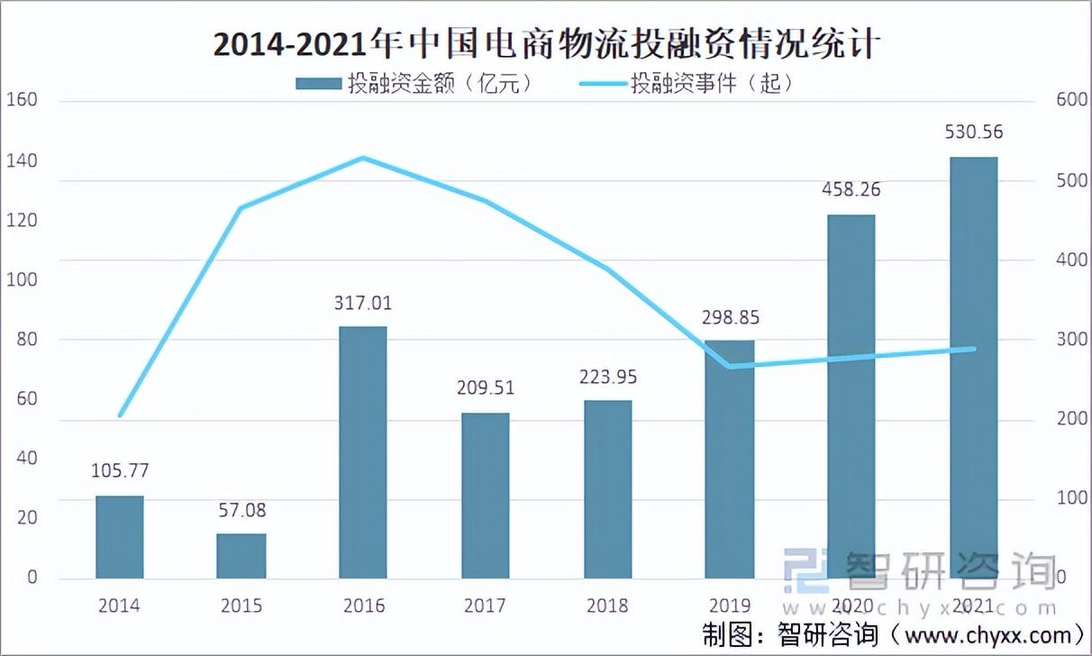 随着中国电商物流市场的高速发展,吸引了一大批投资者的青睐,2021年中国电商物流市场共发生77起投融资事件,投融资金额完成530.56亿元,居近五年来最高水平,资本市场的持续繁荣,带动全产业链受益。