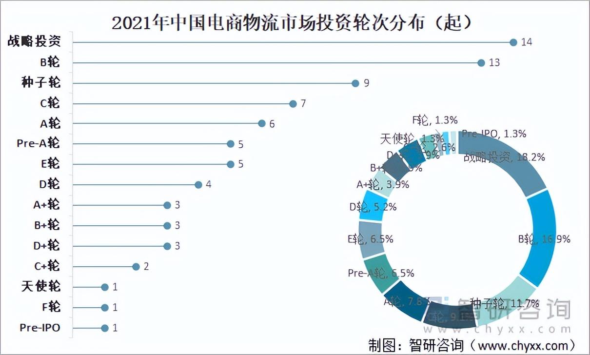 从投资轮次分布来看,2021年中国电商物流市场,战略投资占18.2%,B轮占16.9%,种子轮占11.7%,C轮占9.1%,A轮占7.8%,Pre-A轮占6.5%,E轮占6.5%,D轮占5.2%,A+轮占3.9%,B+轮占3.9%,D+轮占3.9%,C+轮占2.6%。