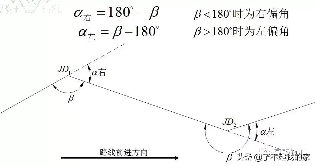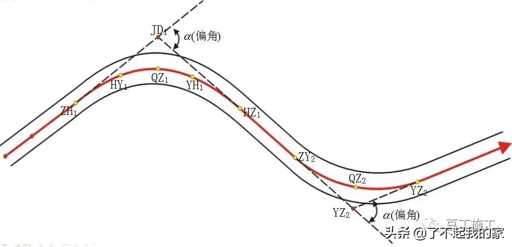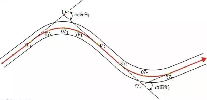 各桩的桩号表示该桩距路线起点的里程,例如:某交点桩距路线起点的距离为3135.12m,其桩号为JD3+135.12。