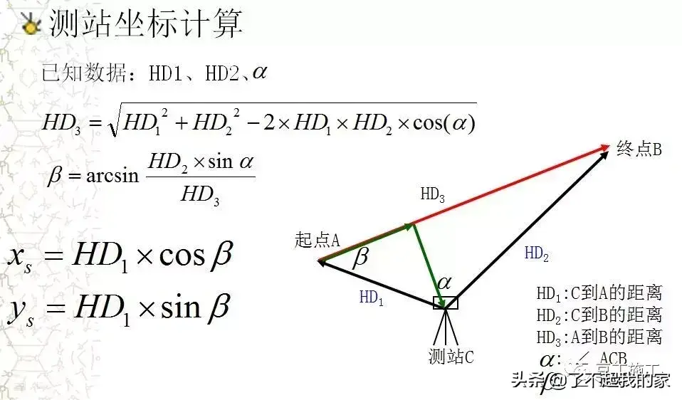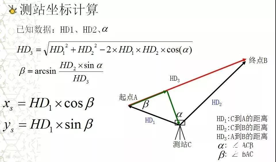 边角交会:需要测量至少两个已知点。全站仪一般是用边角交会
