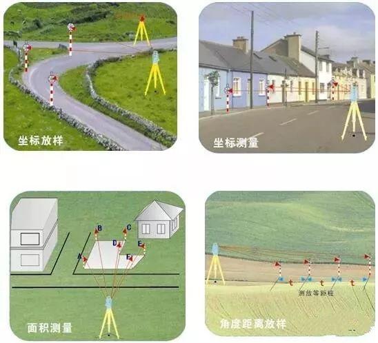 坐标放样、坐标测量、边角放样、对边测量、悬高测量、直线放样、面积测量、后方交会、高程传递、相对直线坐标、坐标正反算、相对直线放样、线路放样、断面测量、地形测量。
