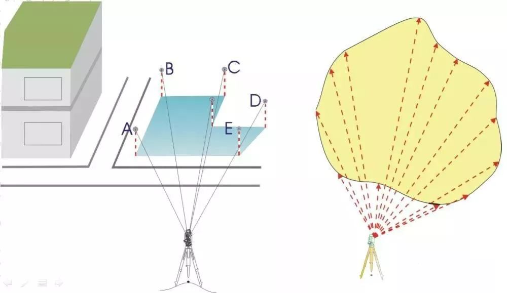 放射对边测量适用于测量各点相对于某基点的距离,如:AB、BC……间的距离。