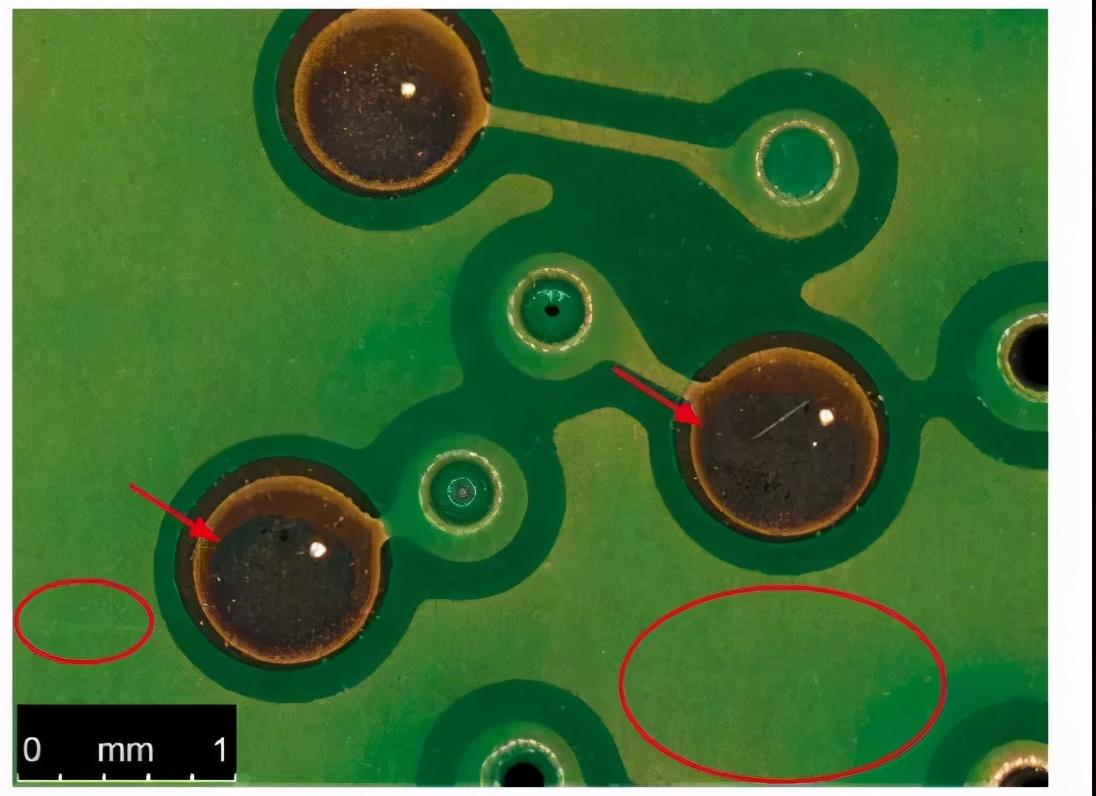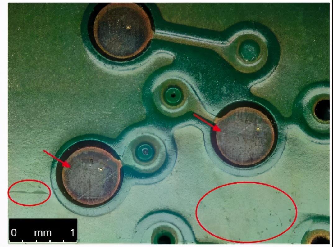 PCB板,倾斜0°+环形光+匀光器 PCB板,倾斜5°+环形光+匀光器,箭头垫片部位有划痕,红圈PCB表面有划痕