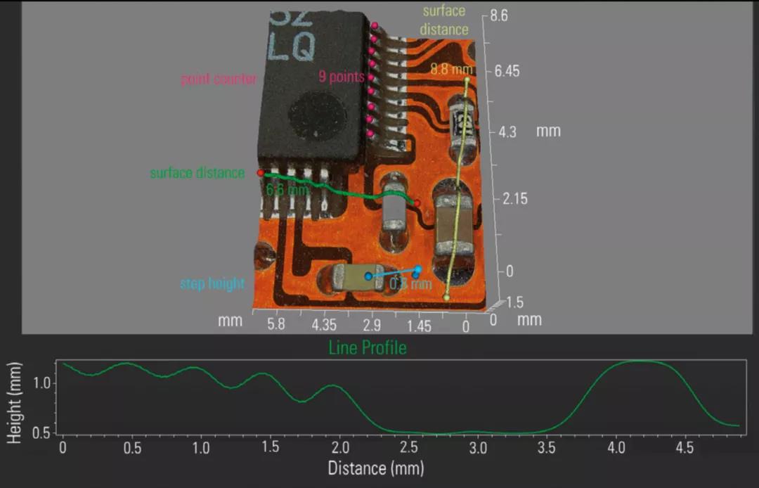 2、二维及三维测量功能: 不仅可对平面进行数据测量,还具备了EDOF景深叠加功能,叠加后的图像可进一步进行三维尺寸测量。