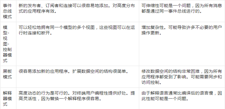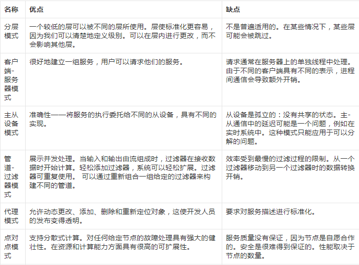 下面给出的表格总结了每种体系架构模式的优缺点。