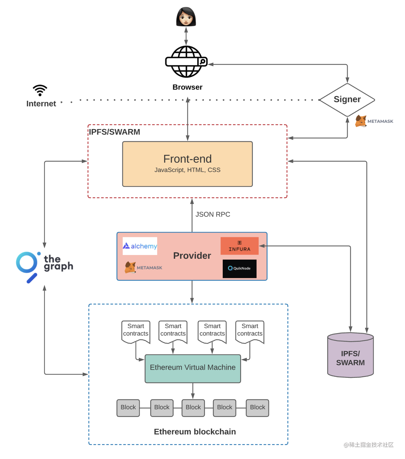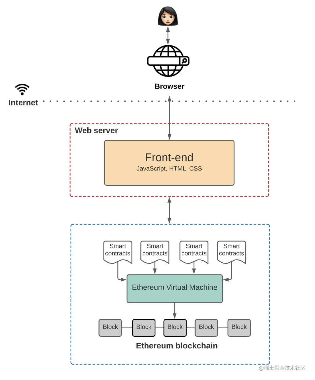 EVM 虚拟机,用于执行合约的环境,相当于执行引擎;OK,视野来到了前端代码部分。按道理将,前端代码应该也是用智能合约的方式实现,实际上,它也确实如此,不过要更为复杂一点。