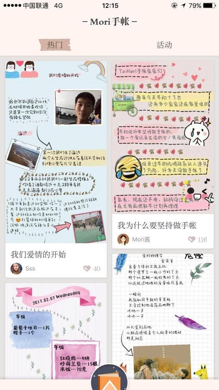 当然,这款产品还兼顾社交功能,旅游、美食、搭配、爱情等不同的主题提供好了模板,你需要做的只是把自己的内容替换进去。在手账社区中,你可以看到其他用户公开的手账作品,如果遇到喜欢的风格,Mori 支持直接采用其他用户的手账格式。