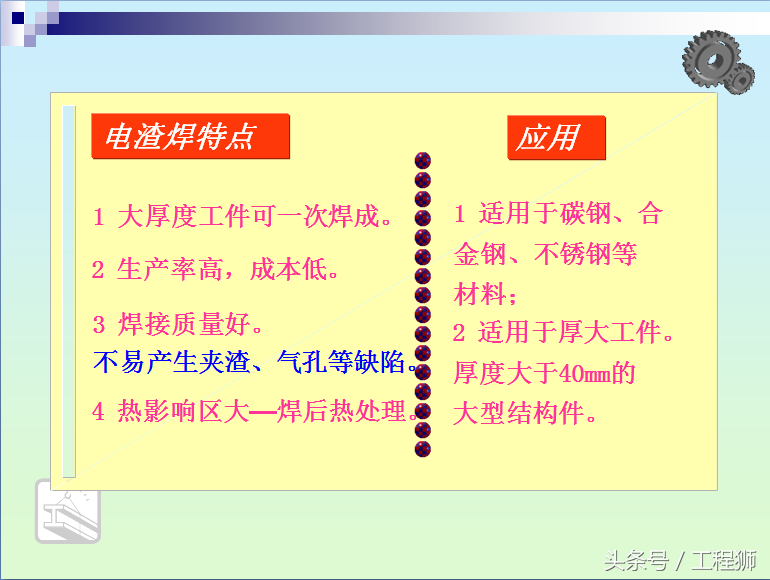 电渣焊的特点:焊接厚度大、焊接质量高、焊接效率高