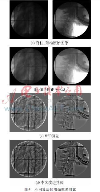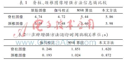 实验对X射线脊柱和颈椎图像[13]进行增强处理,图像大小为1 004×1 004,分别采用伽马校正、MSR算法以及本文改进的算法进行处理比较。