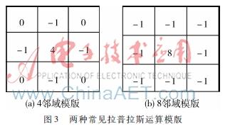 为每一个像素进行同比增强,则增强后的图像的边界和轮廓会比较模糊,因为这种增强方式减小了相邻像素点之间的灰度差异。而人类视觉系统有增强边缘对比度的机制[11],当人眼观察图像中两块亮度不同的区域时,若边缘处对比度增高,会产生强烈的对比和反差,使得图像轮廓更加清晰。拉普拉斯算子可以保留像素之间的灰度差异,增强灰度突变处的对比度,在保留图像背景的前提下突显图像的边缘细节信息。为了更适合于数字图像处理,使用离散的拉普拉斯算子的模版形式。图3所示为两种常见的拉普拉斯模版。图像的边缘就是那些灰度发生跳变的区域,所以拉普拉斯模版有利于突出这些边缘细节信息。