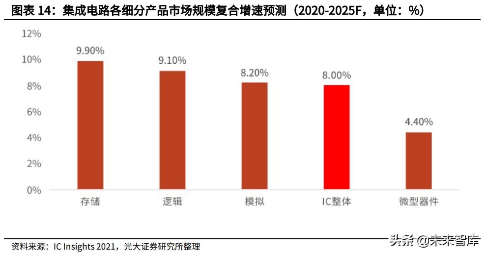 根据 IC Insights 预测,未来五年(20-25 年)整个集成电路行业增速受到下 游汽车电子、5G 通信的应用场景的带动作用,销售额复合增速将达到 8.0%,高于半导体行业整体增速;其中模拟、逻辑和存储 IC 市场增速将分别达到 8.2%、 9.1%和 9.9%,是集成电路细分市场中复合增速最快的三个赛道。