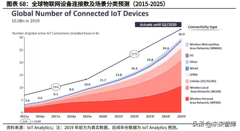 3. AIoT:百亿级别终端数量带来广阔市场空间。 随着通信市场的逐渐成熟, 物联网市场设备连接数量指数级增长。根据 IoT Analytics 预计,2020 年全网物联网连接数量将达到 117 亿部,首次超过非物联网(通信、消 费设备)涉币连接数,15-20 年复合增速达到 29%,预计到 2025 年物联 网连接设备数将超过 309 亿部,五年复合增速为 21%。尽管目前物联网 设备电源链产品单机用量较少,百亿数量级的设备连接数也将为 PMIC 产 品带来广阔市场空间。