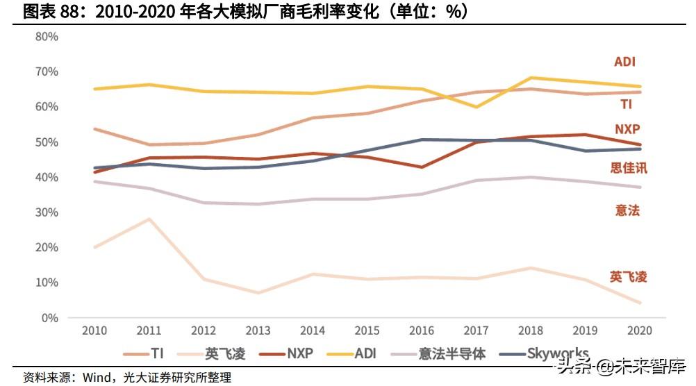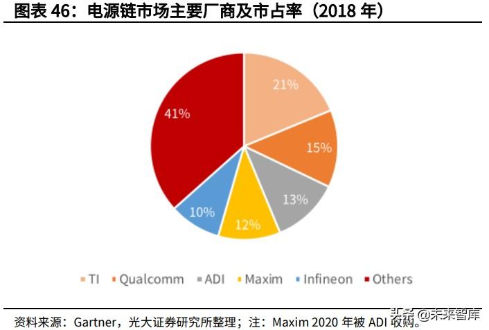 即使前十大厂商之间的并购比较罕见,TI 及 ADI 的领先地位稳固,然而模拟 市场天生重经验,轻路径依赖,人才至上的特点决定了其并购发展的重要性,头 部厂商借助规模及利润优势,凭借收购不断拓展产品和技术边界,抢占新兴下游 专用市场。2019 年,前十大厂商份额合计首次突破 60%,达到 67%,而随着疫 情的进一步影响,模拟市场非头部公司处境较差,20 年下半年开始的晶圆产能缺 货问题又将进一步压缩没有 IDM 厂房的模拟厂商份额,预计未来整体模拟市场格 局将进一步集中化,头部厂商不断收购整合其他厂商剥离的模拟类业务,快速发 展壮大。