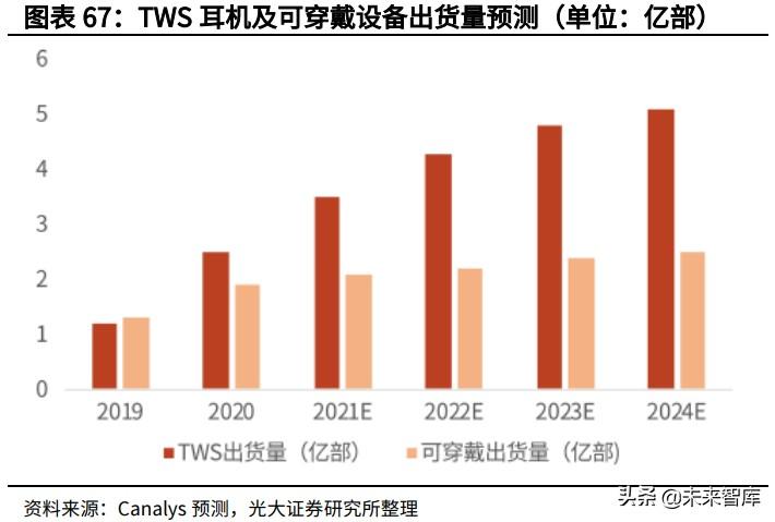 除手机市场外,TWS 及可穿戴设备等新兴产品也不断拓展消费类电源链 产品的边界。根据 Canalys 预测,2024 年 TWS 耳机市场出货量将超过 5 亿部,可穿戴设备出货量超过 2.5 亿部。小型可穿戴设备中,电源链产品 包含无线充电管理芯片、同步稳压器、LDO、过载电流保护 IC、音频驱 动等等不同产品,同时对电源链芯片的集成化程度、体积及散热性能也 提出了更高的要求。下游设备的新品推出及出货量增长将继续推动消费 类电源链产品市场多样化高速成长。