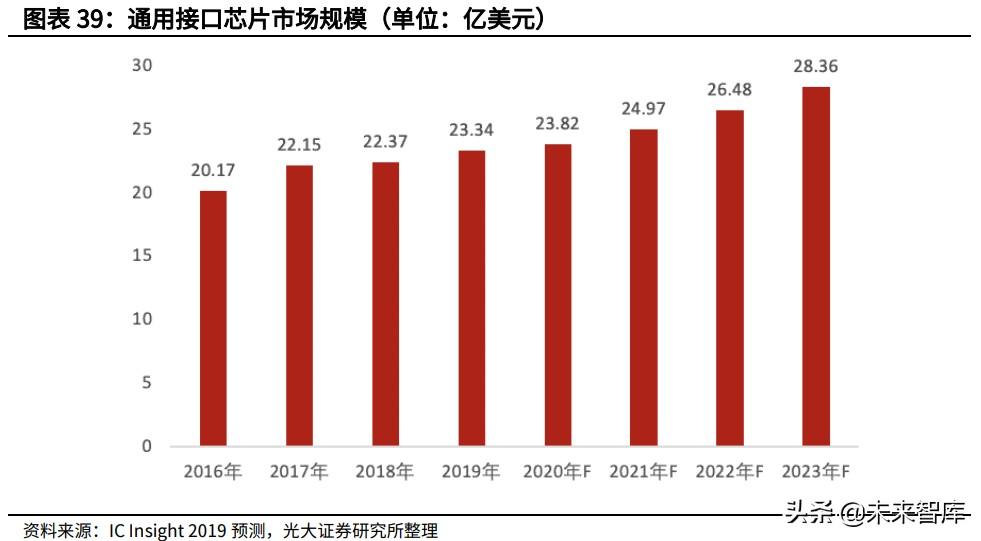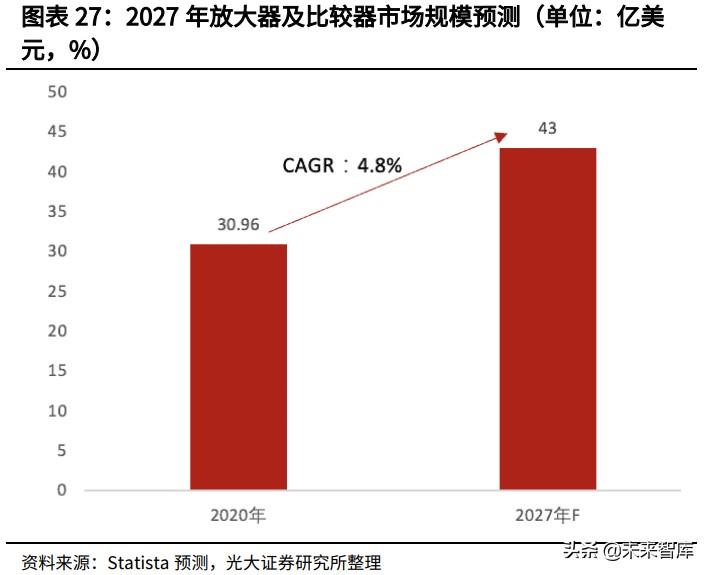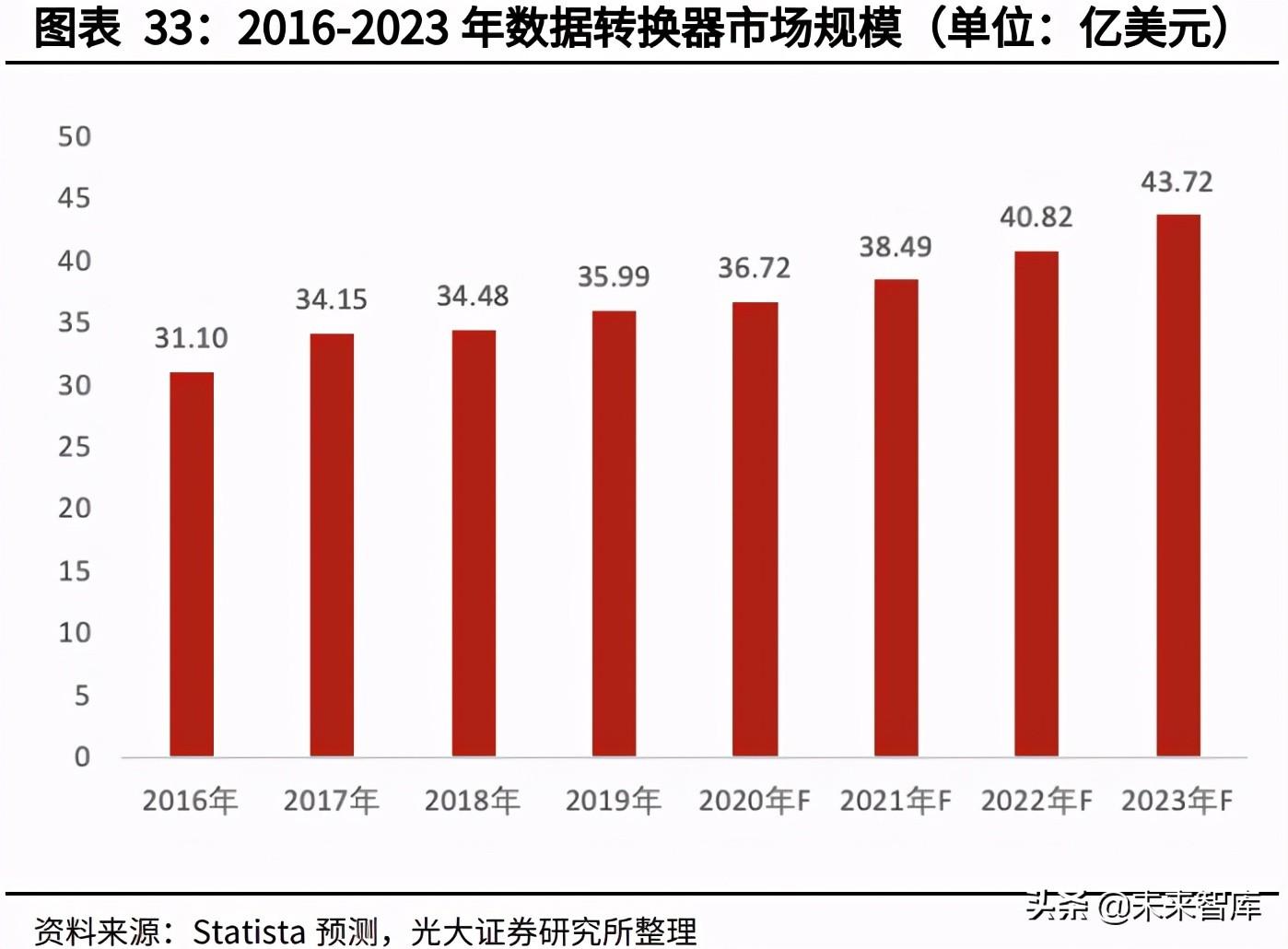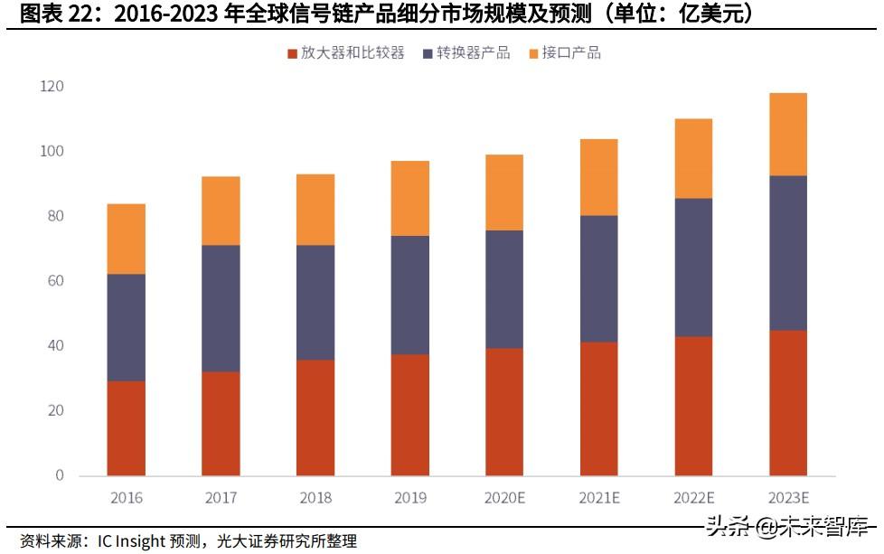 根据 IC Insight 的预测,全球信号链市场规模从 2020 年开始复苏,2020-2023 年的年均复合增长率约为 6%,低于整个模拟行业 8%的复合增速。但是由于信号 链产品在模拟 IC 中不可替代的作用,下游应用工业、汽车、通信等行业的需求将继续上升,ADI 和 TI 等头部厂商继续加码研发,该领域在未来依旧是各大厂商重 要发展基点。
