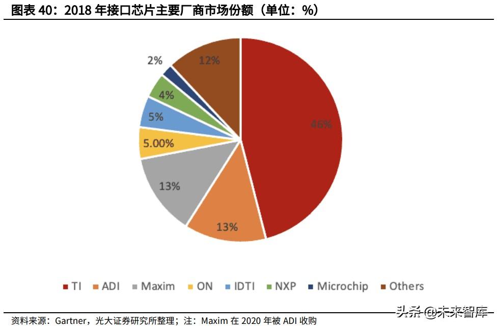 两极格局,ADI 和 TI 领跑信号链产品, 二者在各细分领域市场份额之和超 50%。自 2000 年后,ADI 通过一系列并购不断提高其在信号链产品的资源整合能 力,目前 ADI 在线性产品和数据转换芯片已位于行业第一。近年来 TI 在电源管理 芯片领域不断加码,信号链产品在总营收中占比逐渐下降,目前 TI 在接口芯片占 据半壁江山。因此,信号链产品将在相当长时间内呈现两极竞争格局。