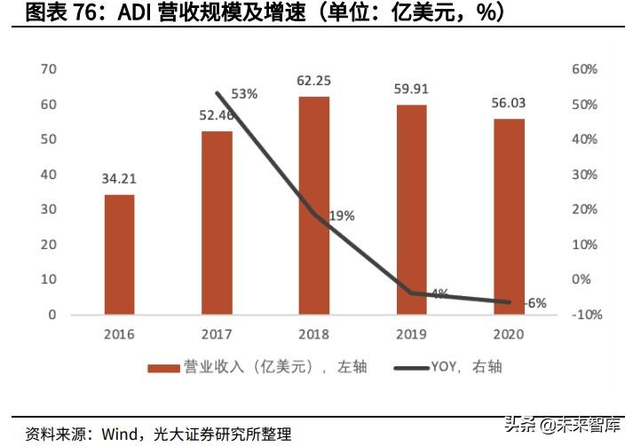2008 年,ADI 成立事业部制与公司产品线交叉,共同推动 ADI 的创新向前发 展,并将此战略称为“Beyond Moore(超越摩尔)”,主要关注于消费电子、 医疗健康、工业自动化、通信基础设施和汽车电子等应用场景,并从系统应用 的角度来定义产品。公司一方面不断推出更具创新力的产品,另一方面在原有 的核心基础上,借助外部吸收的技术来构建更加复杂的系统。对各个应用领域 的理解和长期积累,以及对摩尔定律及数字、模拟信号的深入理解,是公司能 够屹立芯片浪潮之巅的核心优势。