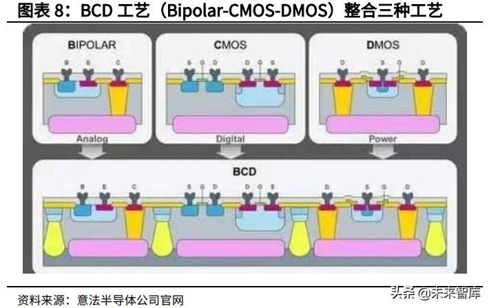 生产工艺因需求不同而多样化。 CMOS 工艺由于发展完备,制程不断缩 小成为数字 IC 采用的主流。但模拟 IC 由于往往需要高电压、低失真、 高信噪比的需求,CMOS 工艺驱动能力较差,很难满足模拟电路需求。