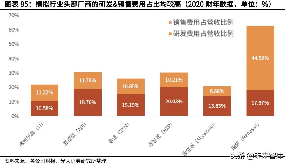 我们统计了模拟行业龙头厂商的 2020 年研发投入和销售费用占其营收比例 情况,不管是模拟 IC 还是功率半导体龙头厂商的研发投入占比和销售费用占比都 超过了 10%。其中,亚德诺(ADI)的销售费用占比更是超过了 10%,而研发投 入占比达到 18.76%,在模拟行业头部厂商中处于领先地位,从而获得在信号链细 分市场的技术领先地位。通过对头部厂商财务数据的分析,我们可以看出销售及 研发是支撑模拟芯片企业发展、取得技术产品竞争优势的两大重要因素。