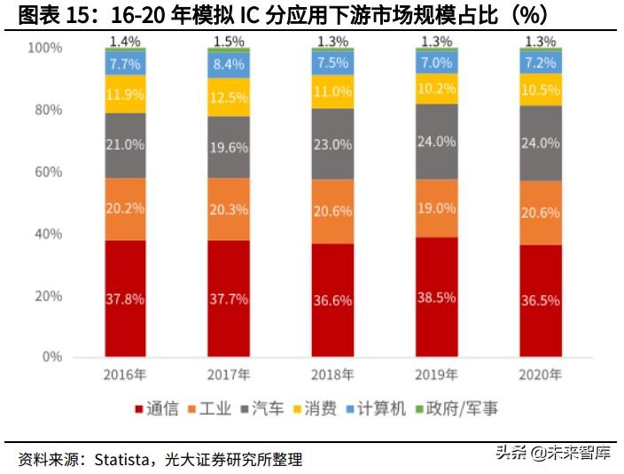 模拟 IC 的下游应用场景包括通信、工业控制、汽车电子、消费类和政府军事 等用途,其中最大的下游应用是通信类市场,典型产品如基站信号链、射频 IC 等 等,2020 年占比份额达到 36.5%。汽车电子近五年(16-20 年)受益于新能源车 的下游需求发展,增长最为迅猛,已经成为下游第二大应用场景,市场份额占比 达到 24.0%。