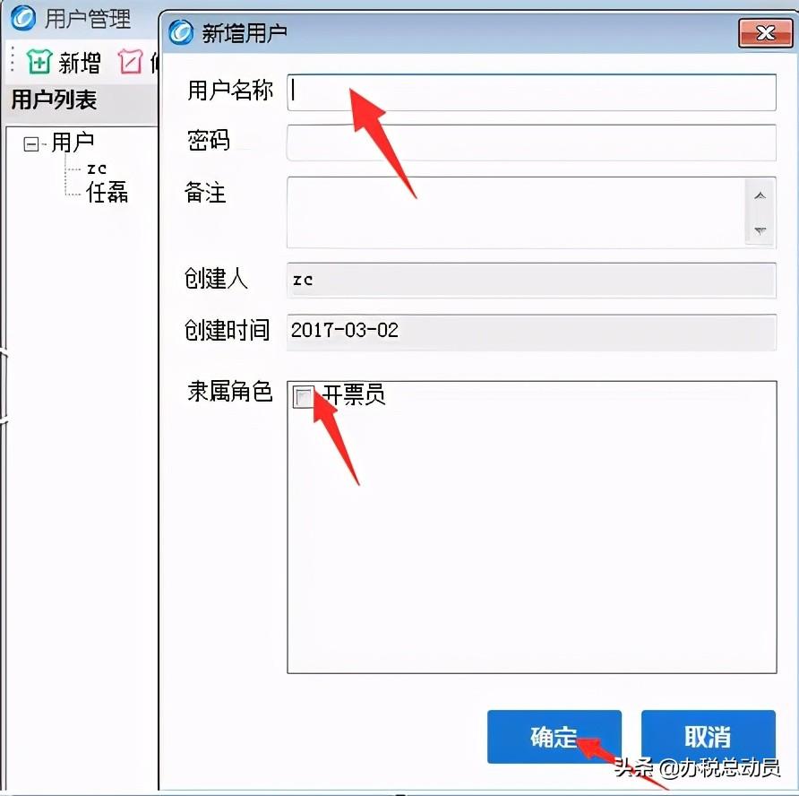 第三步:【用户名称】输入开票员名字,【密码】长度为6-16位(非必填),【隶属角色】开票员前面点“√”点确定即增加成功。