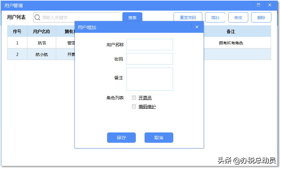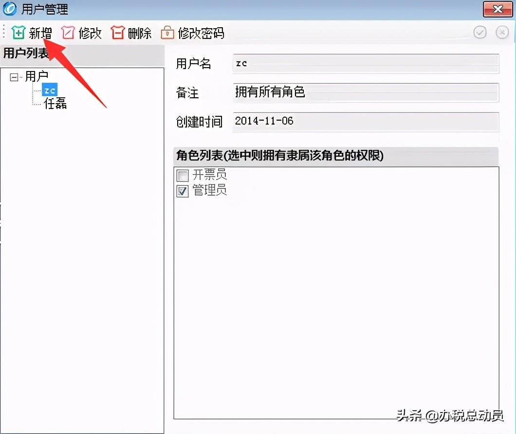 第三步:点击【增加】,输入“用户名称”“密码”,角色列表中“开票员”前面打√点保存即增加成功。