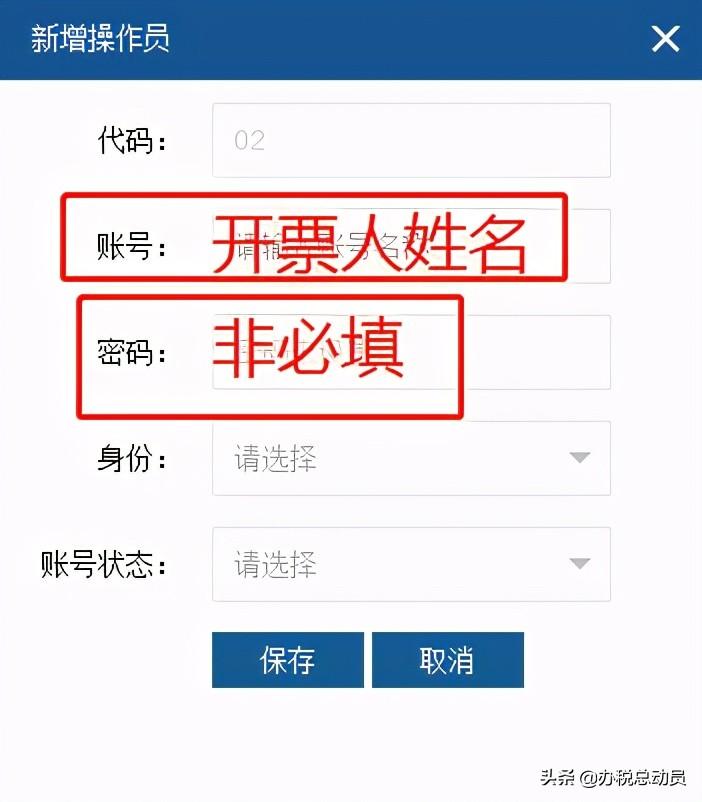 在【账号】输入开票员的姓名,密码可以不设置,【身份】选择开票员,点击保存。