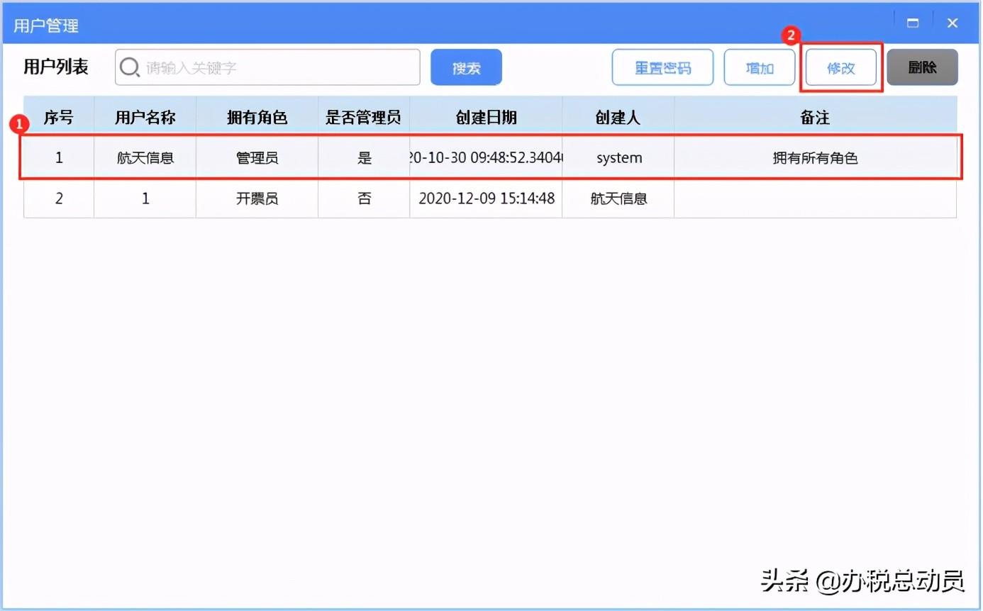 第三步:将用户名称修改成需要的名称后点击【保存】。角色列表选择【开票员】。
