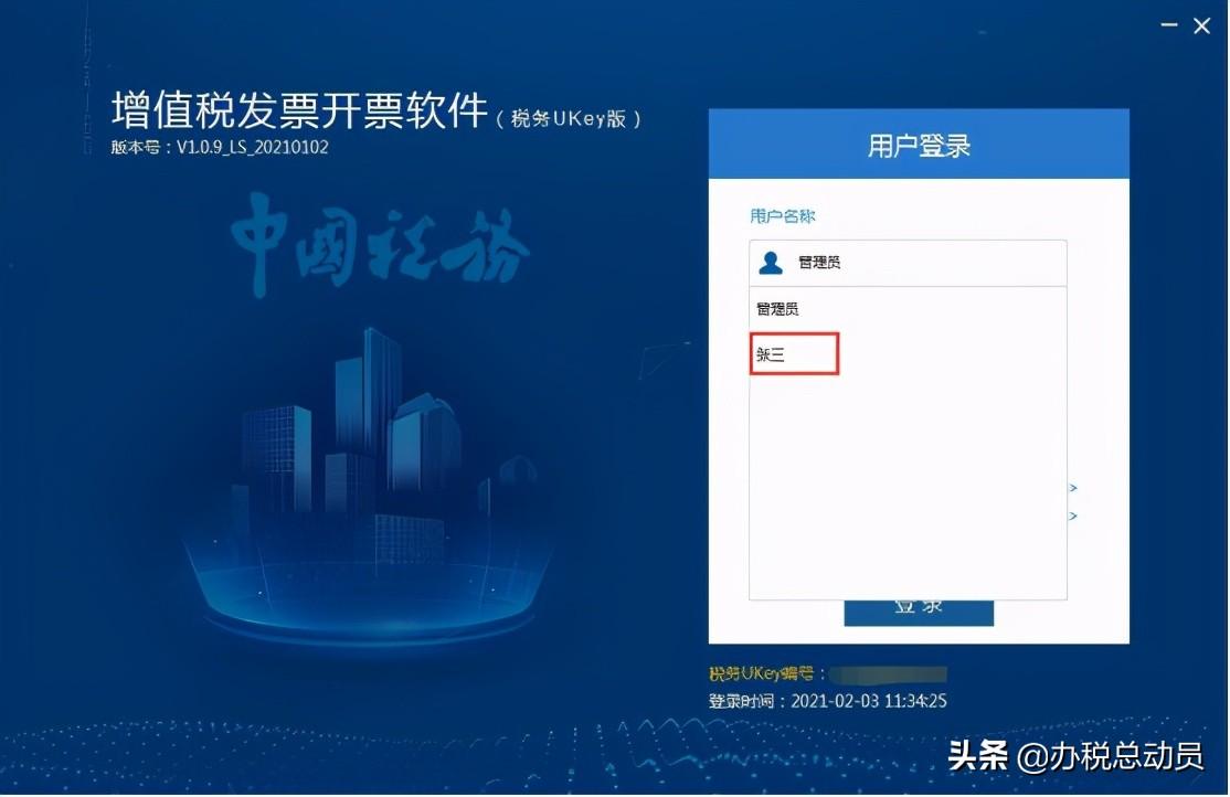 第四步:设置完成后,重新登录开票软件,下拉选择开票员登录。实际开具发票时,开票人一栏显示的名称就是刚才修改好的名字。