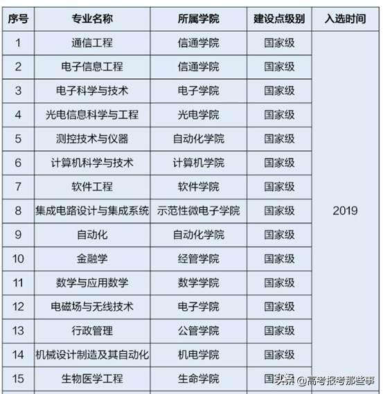 除了这9个专业之外,2019年还有15个专业入选国家一流专业,他们大都是电子科技大学的王牌当中的王牌,他们是通信工程,电子信息,光电信息,测控,计算机,软件,集成电路,自动化,电磁场,机械,生物医学,数学与应用数学,金融和行政管理。