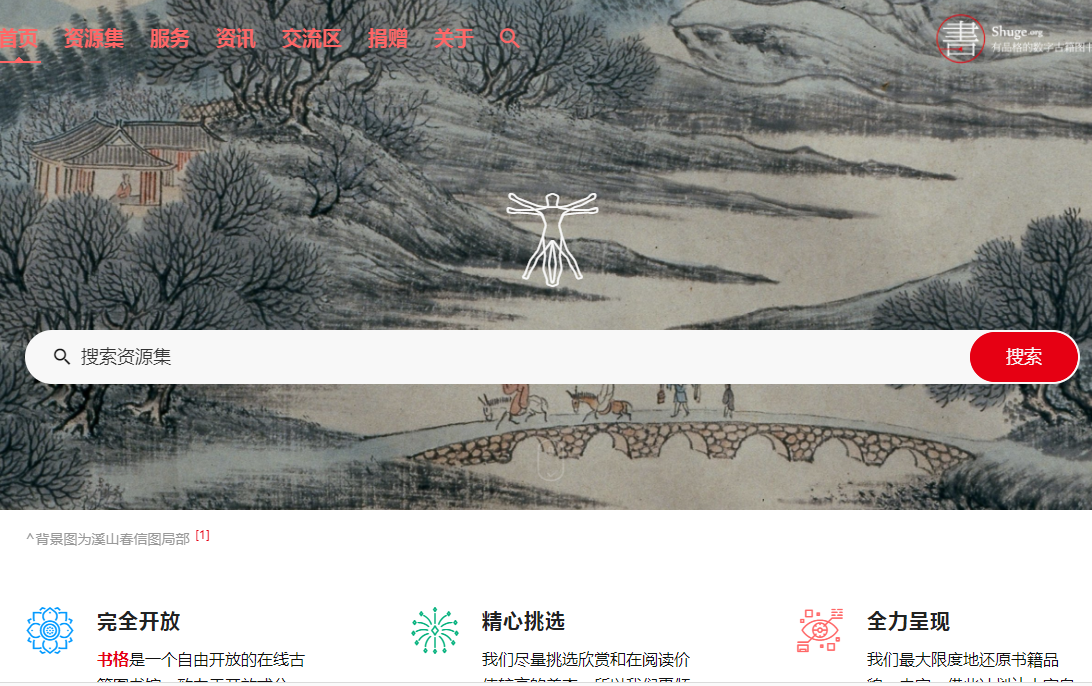 书格(Shuge.org)是一个自由开放的在线古籍图书馆。致力于开放式分享、介绍、推荐有价值的古籍善本,并鼓励将文化艺术作品数字化归档。发布的书籍主要以高清彩色影像版本 PDF 格式。书籍刊行年代有从宋元珍本,明清善本到近代刊本。最大限度地还原书籍品貌、内容,方便大家自由、免费地欣赏到那些难以现世的书籍,从中感受到人类文明进程。