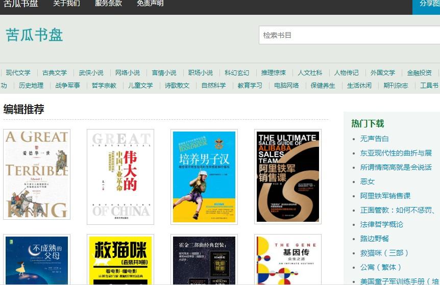 苦瓜书盘是供网友交流适合电纸书阅读的6寸pdf及mobi格式电子书制作技术的网站,提供电子书分享的平台。电子书类型涉及现代文学、古典文学、武侠小说、网络小说、言情小说、职场小说、科幻玄幻、推理惊悚、人文社科、 人物传记、外国文学、金融投资、管理书籍、励志成功、历史地理、战争军事、哲学宗教、儿童文学、诗歌散文、自然科学、教育学习、电脑网络、保健养生、生活休闲、期刊杂志、工具书等类型。