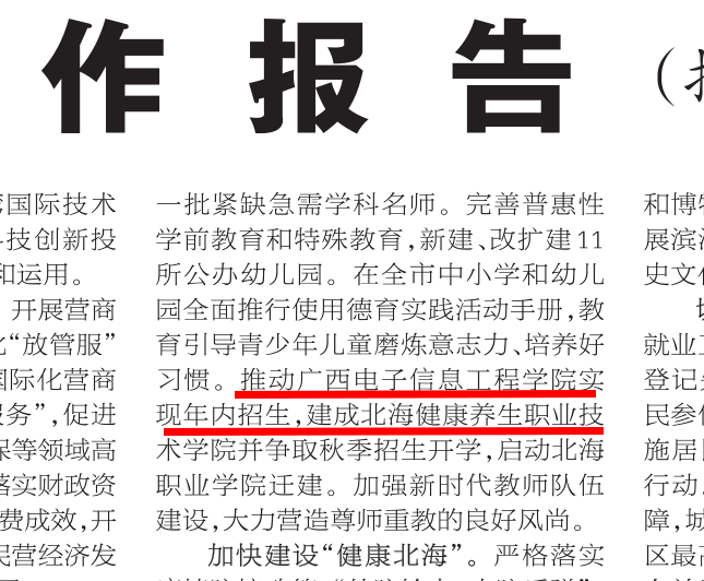 进入2021年,北航北海学院终于盼来了好消息,这次是官方的好消息,而不是小道消息了。近日,在北海市的政府报告里提到:在2020年,北海加快推动北航北海学院与桂电北海校区合并转设为广西电子信息工程学院,将成为自治区直属公办全日制本科高校。2021年,北海市将推动广西电子信息工程学院实现年内招生,建成北海健康养生职业技术学院并争取秋季招生开学,启动北海职业学院迁建。
