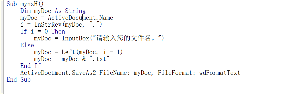 ActiveDocument.SaveAs2 FileName:=myDoc, FileFormat:=wdFormatText