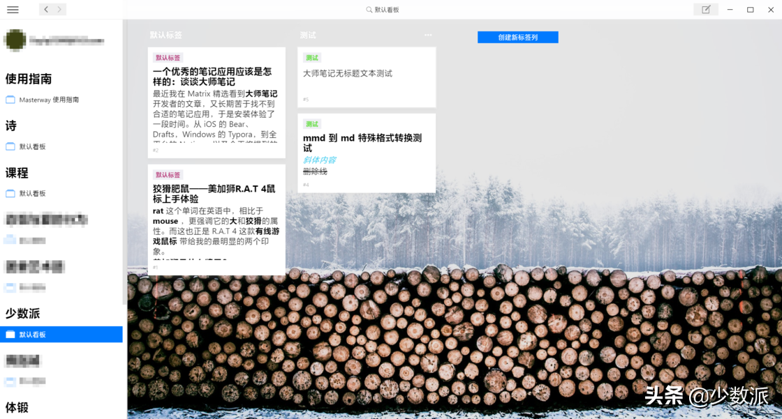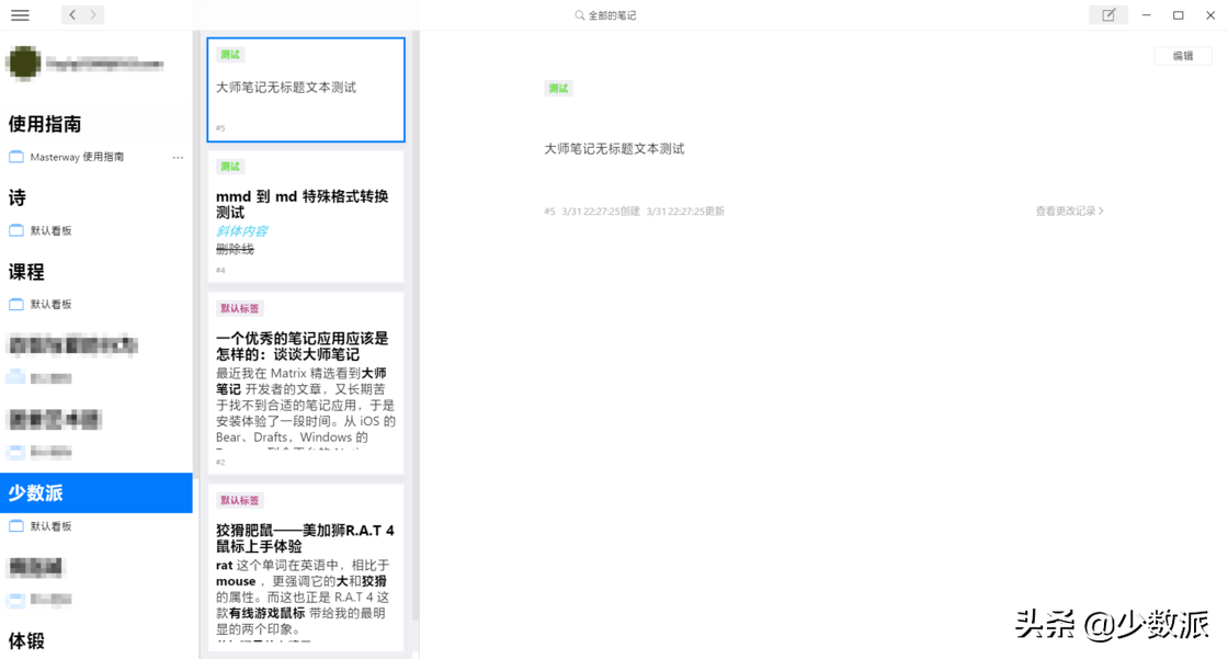 不谈工具,先谈需求最后一个笔记应用大师之路写在最后最近我在 Matrix 精选看到 大师笔记 开发者的文章,又适逢苦于找不到合适的笔记应用,于是安装体验了一段时间。从 iOS 的 Bear、Drafts,Windows 的 Typora,到全平台的 Notion,以及今天将提到的大师笔记,我已经体验过许多在不同设计理念下诞生的笔记应用。