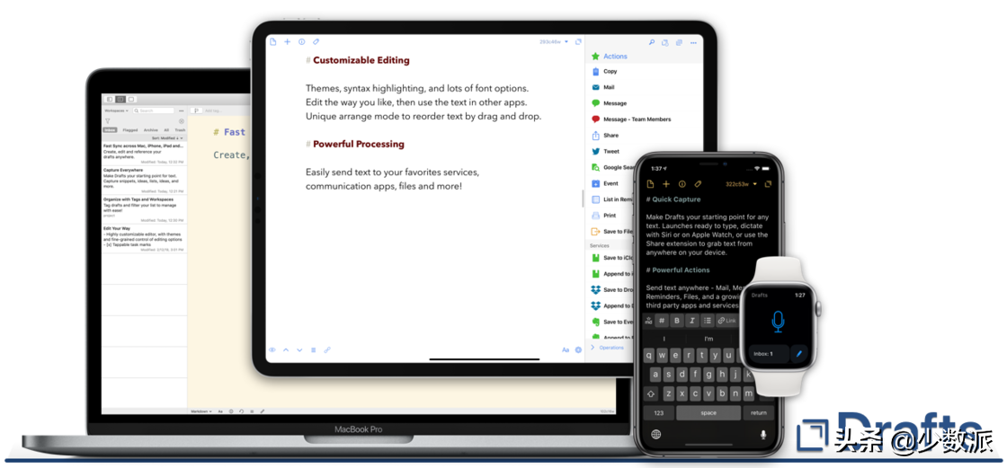 前文提到,我认为 Drafts 是一款「非典型笔记应用」。诚然,它最低限度地 具备很多笔记应用该有的基本功能:支持 Markdown、标签系统、同步系统(仅 iCloud),但我认为 Drafts 与其说是一款「笔记应用」,倒不如说是一个移动端文本入口 。(他们官网的 Slogan 就是 Drafts. Where Text Starts.)