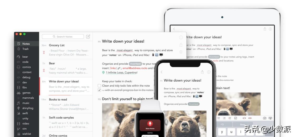 Bear 是我第一个接触的支持 Markdown 语言的笔记应用。其实以它为 Markdown 入门并不是一个很好的选择,因为它修改了一些 Markdown 的基本语法——虽然这是可在软件内更改的(你可以在「设置 - 通用」中选择是否开启「Markdown 兼容模式」)。写作手感称不上出色,常常可能碰到无序、有序列表呈现的状态和想象中不一样的情况。