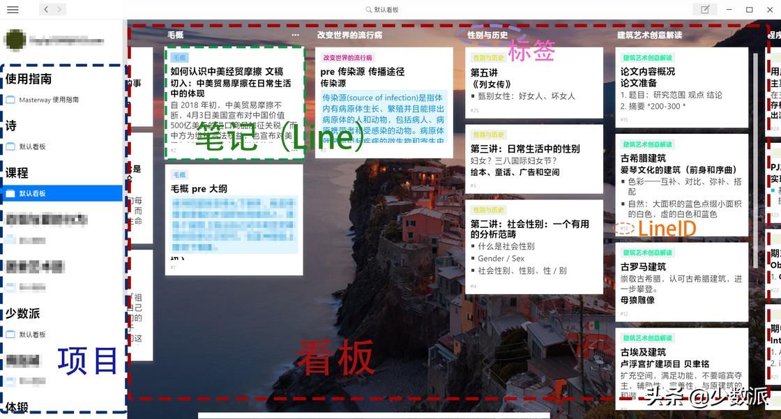 大师笔记希望通过这样的「项目 - 看板 - 标签 - 笔记 - LineId」 系统来管理文档。