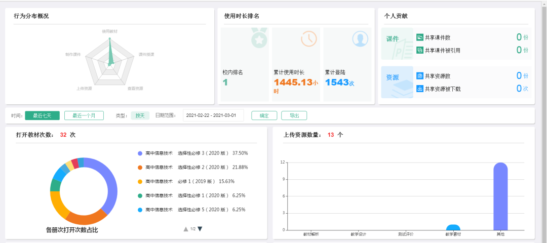个人轨迹功能可对用户的使用行为数据进行统计,便于用户直观地进行学习分析和自我管理。