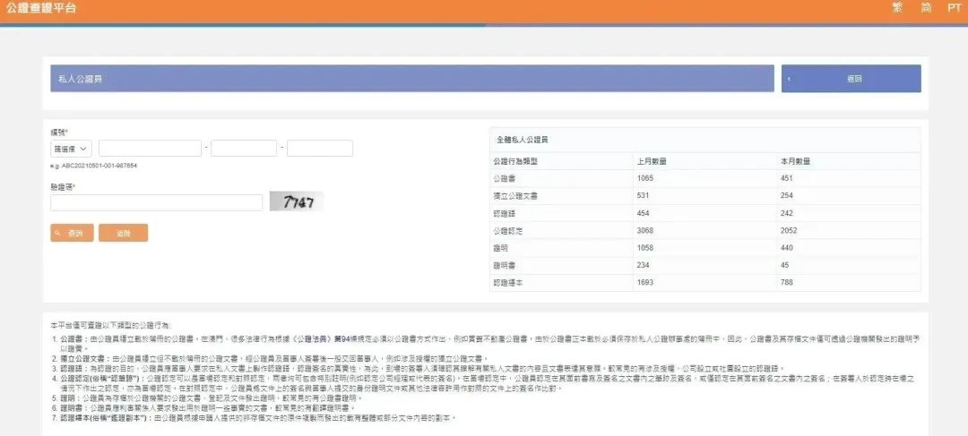 继2021年推出民事、商业、动产及物业登记证明查证平台和公证查证平台服务后,2022年第四季再推出私人公证员公证查证平台服务,将公证文件查证服务由公共公证员拓展至私人公证员,方便公证文件的接收方即时核实文件的真实性,保障交易安全,提高本澳发出的公证文件之可信度。