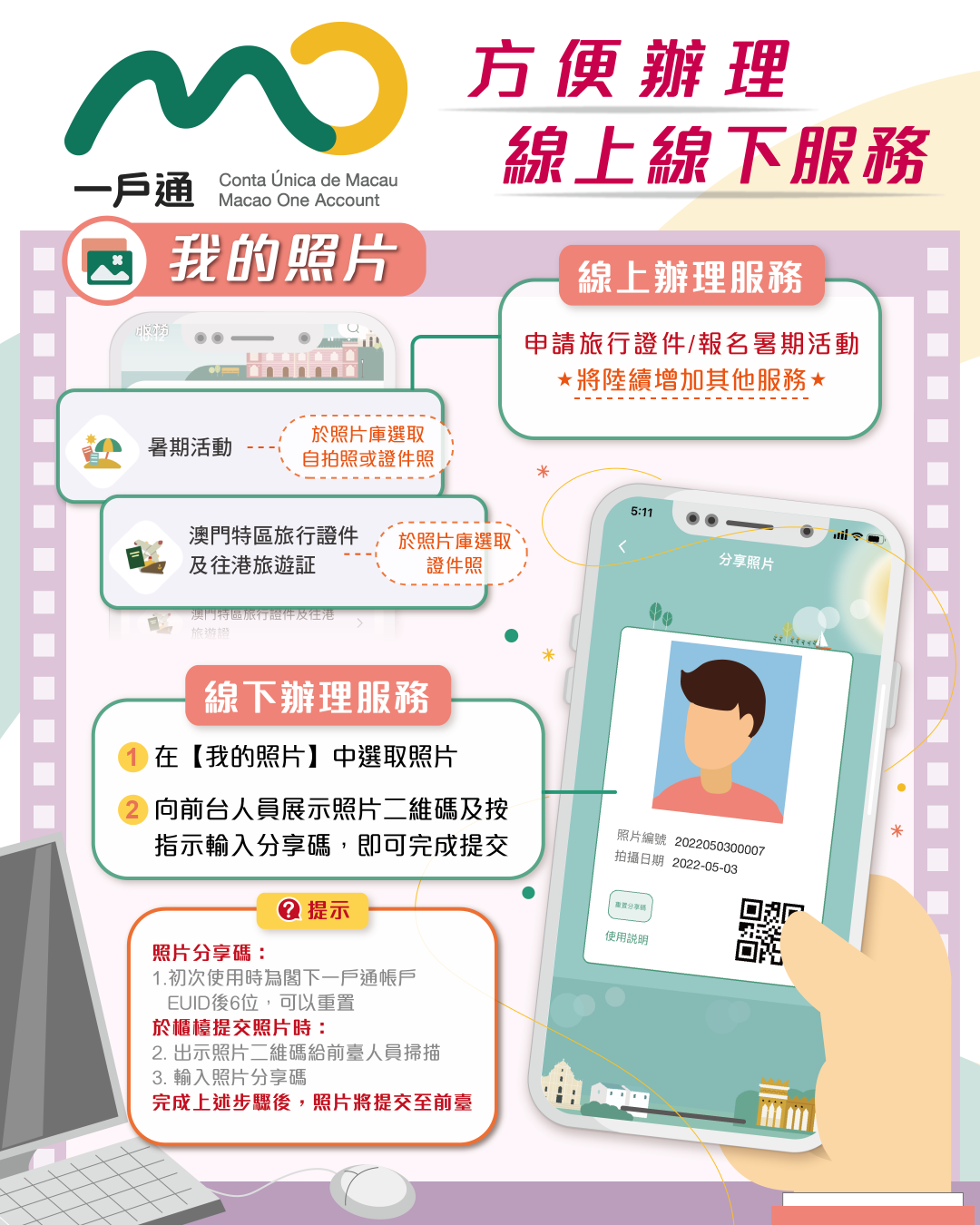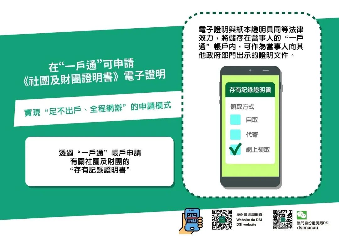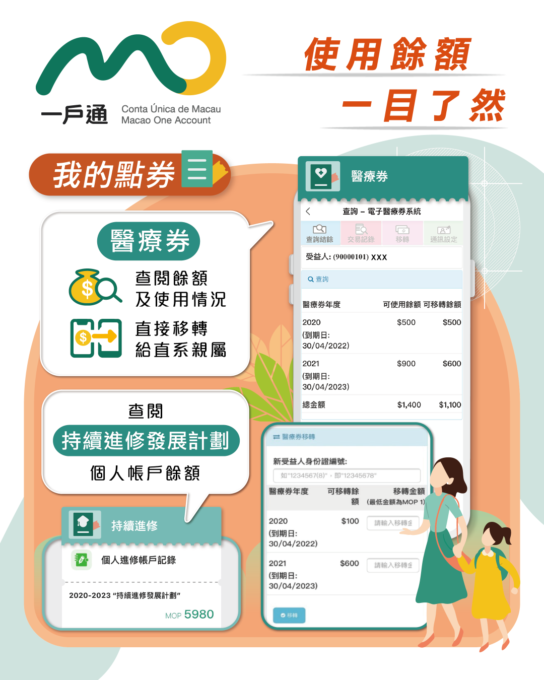 此外,“一户通”2.0亦提供更多高频有感且涵盖不同使用群体的个人化服务 ,包括:查看医疗券及持续进修余额、新冠疫苗接种及核酸检测预约、公共部门活动报名和场地设施预约,以及申请澳门特区旅行证件、个人资料证明书、亲属关系证明书、社团及财团证明书等。