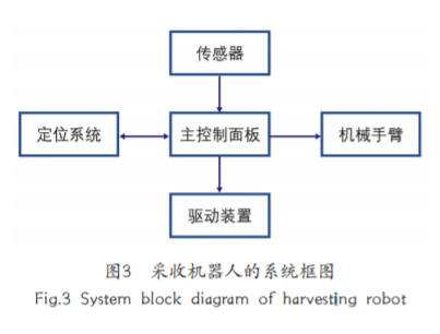 当前,农作物采收大多可以通过具备机器视觉、 感知、操作等多项功能的采收机器人实现。采收机 器人系统框图如图 3 所示。在配置有定位技术的情 况下,智能机器人可按照期望的轨迹行进,避免与 农作物碰撞而造成农作物损坏。采收过程中,机器 人手臂的彩色摄像装置可检测果实的成熟度,此外, 内置的压力传感器能够防止采摘过程中压力过大损 坏果实。智能机器人可在农忙季节快速对农作物进 行抢收,节约更多的人力和时间。