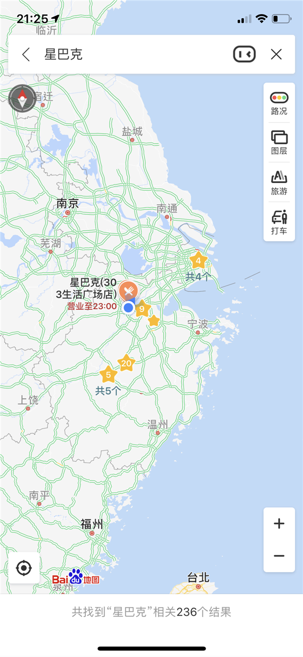 使用百度地图搜索星巴克后缩小地图得到的结果