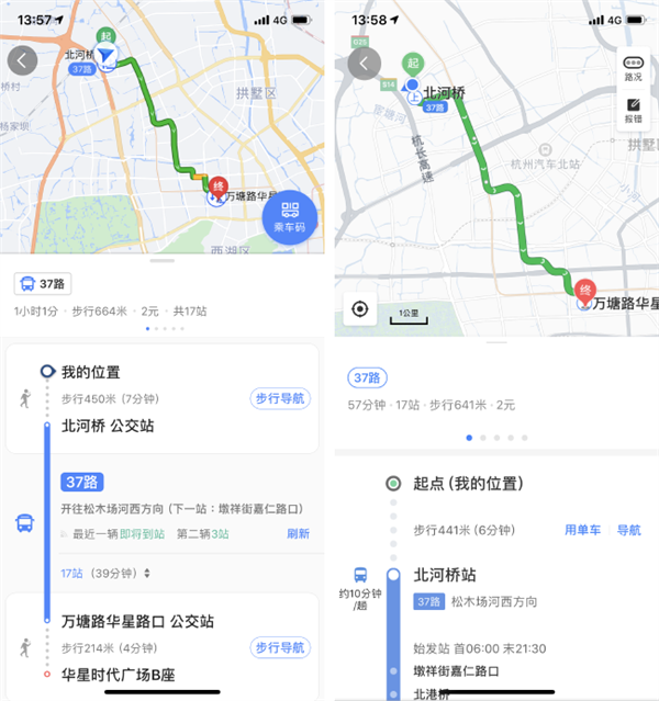 以日常通勤而言,以我在杭州实测的经验来看,高德地图在乘车码支付跳转和实时公交展示方面做得更胜一筹。高德地图也可以直接唤出公交卡。