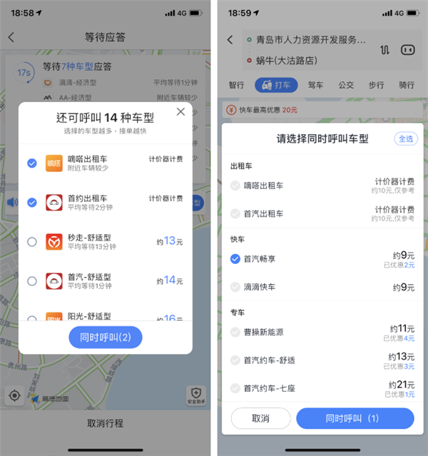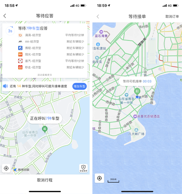 高德地图(左)和百度地图(右)的打车等待接单页面