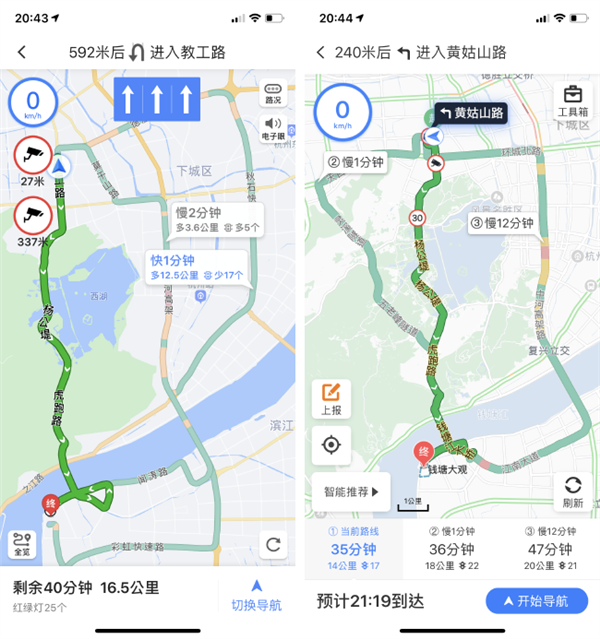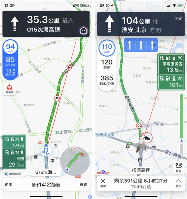 高德地图(左)和百度地图(右)高速公路区间测速的显示界面