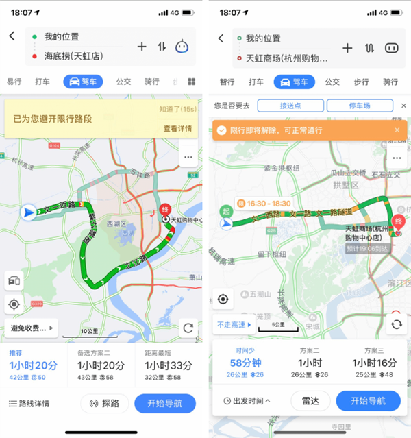 高德地图(左)和百度地图(右)对于限行即将结束时的路线规划